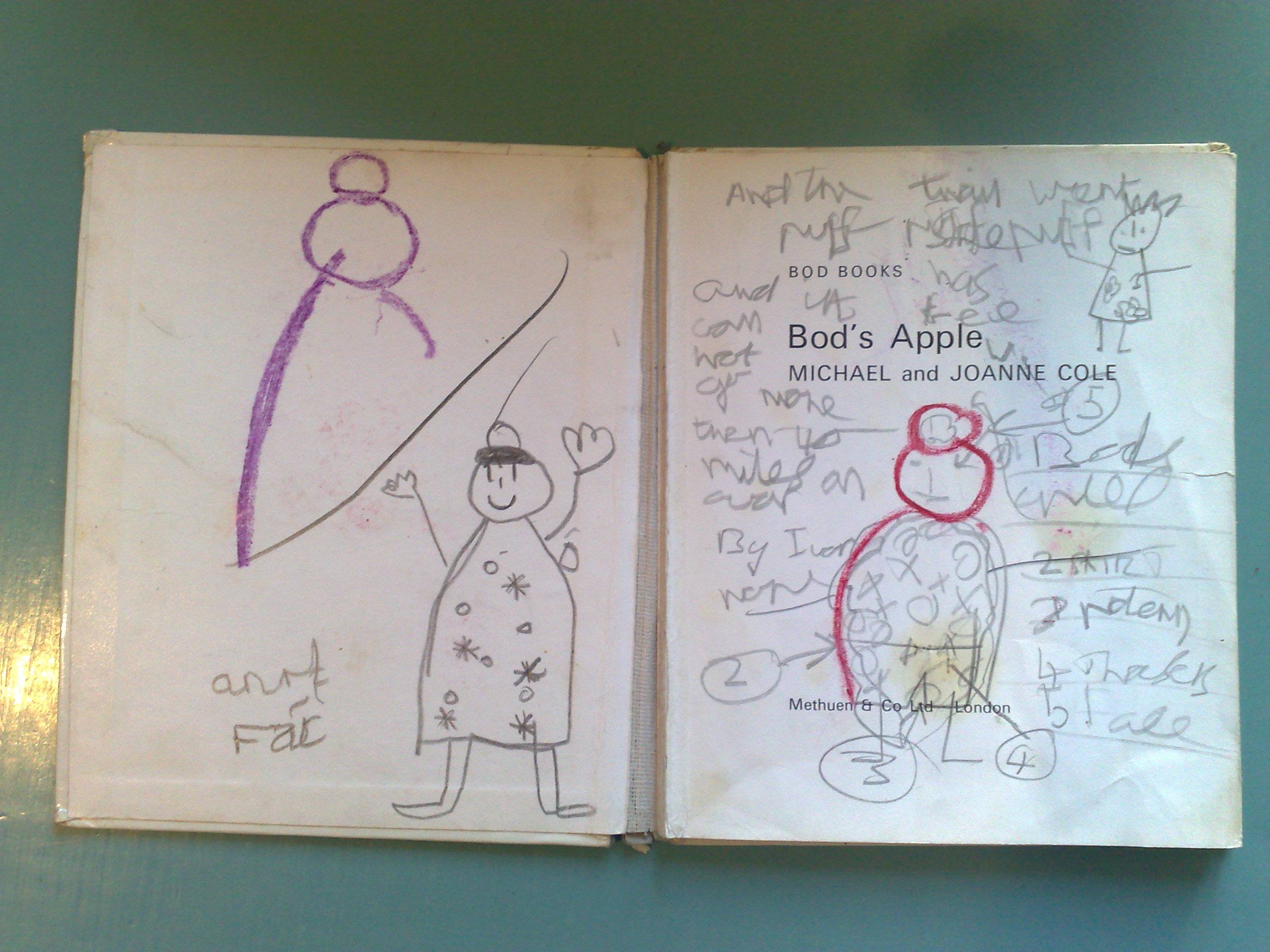 Bod And The Apple First page | Previous page | Next page ![]() Ivan Pope: You can see how loved this book was by the amount of annotation. You can see here the first glimmerings of markmaking and annotation. Information collection, that is a marker of my work. Replication, mapmaking, annotation - it's all here. But that's not the real story ... |