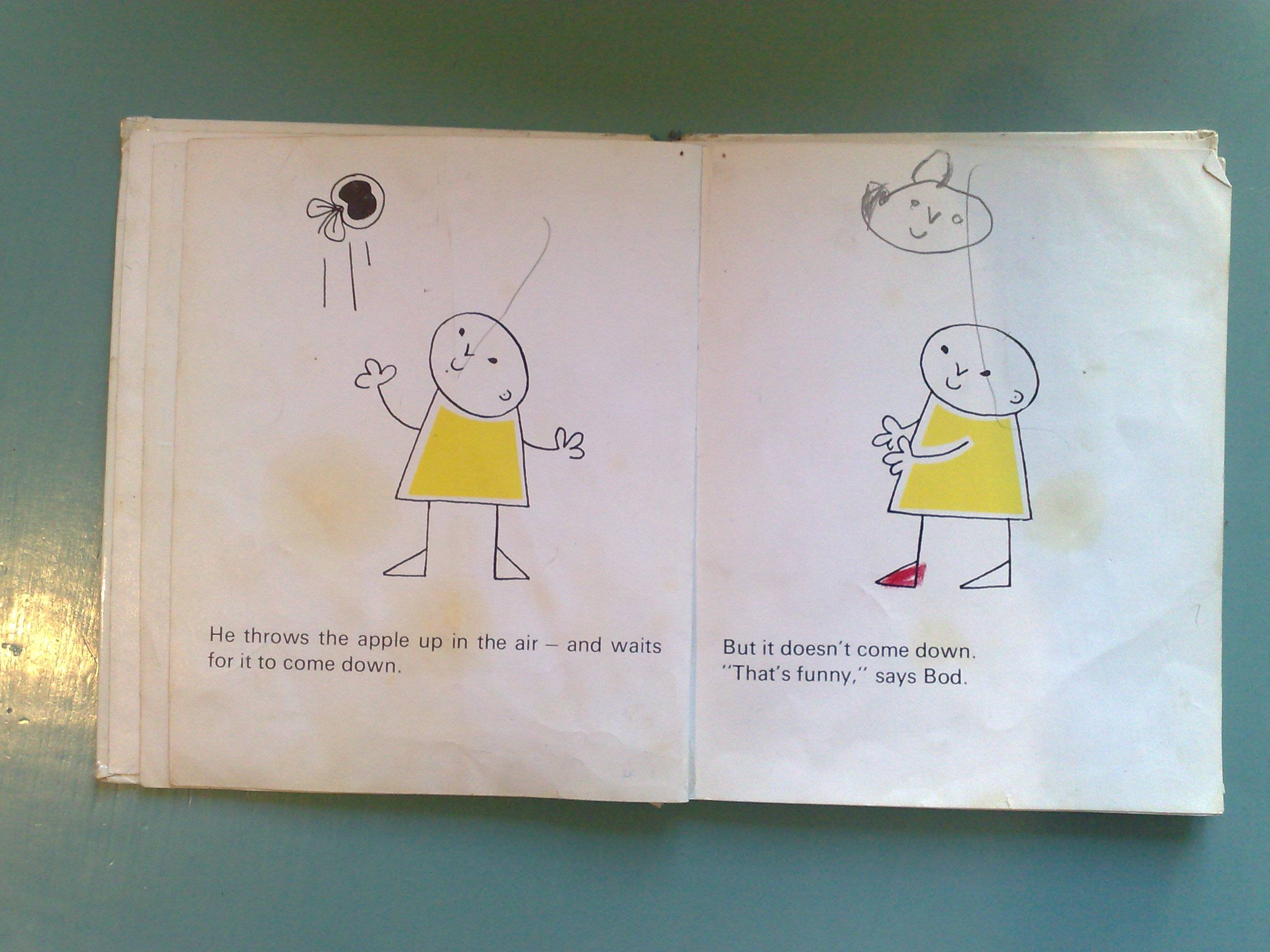Bod And The Apple First page | Previous page | Next page ![]() Ivan Pope: He throws the apple up in the air - and waits for it to come down, Sound familiar? That's what artists do. We spend a lot of time waiting for our ideas to come down again. Generally they do, with a bump. But it doesn't come down, Aha! How can it be that an idea, thrown up in the air doesn't come down again? "That's funny," says Bod, Oh god, the first inkling of the power of art. I did that. I threw that idea up in the air - and it hasn't come down again. From this point all doors open ... |