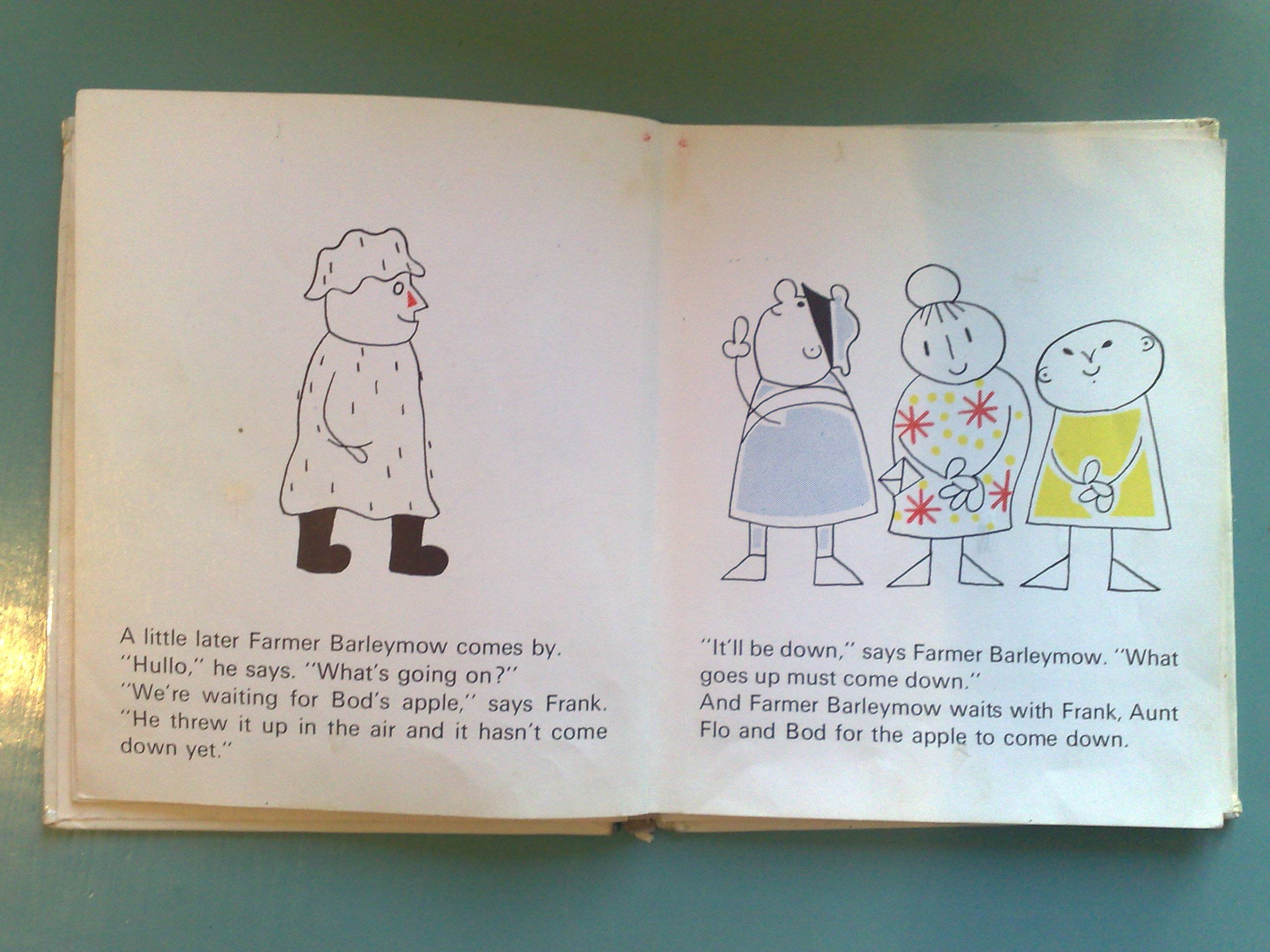Bod And The Apple First page | Previous page | Next page ![]() Ivan Pope: A little later Farmer Barleymow comes by. Farmer Barleymow represents the pleasures of the earth, of the teet and (later) of the body. He brings the sustenance that Bod needs to survive. He is obviously at some level also the supplier of apples. This man knows apples. "It'll be down," says Farmer Barleymow. "What goes up must come down." Even the one who supplied the apple, the medium upon which the concept is made, does not have much of an idea beyond platiitudes. He knows his onions and his apples but not his art. He waits with them. |