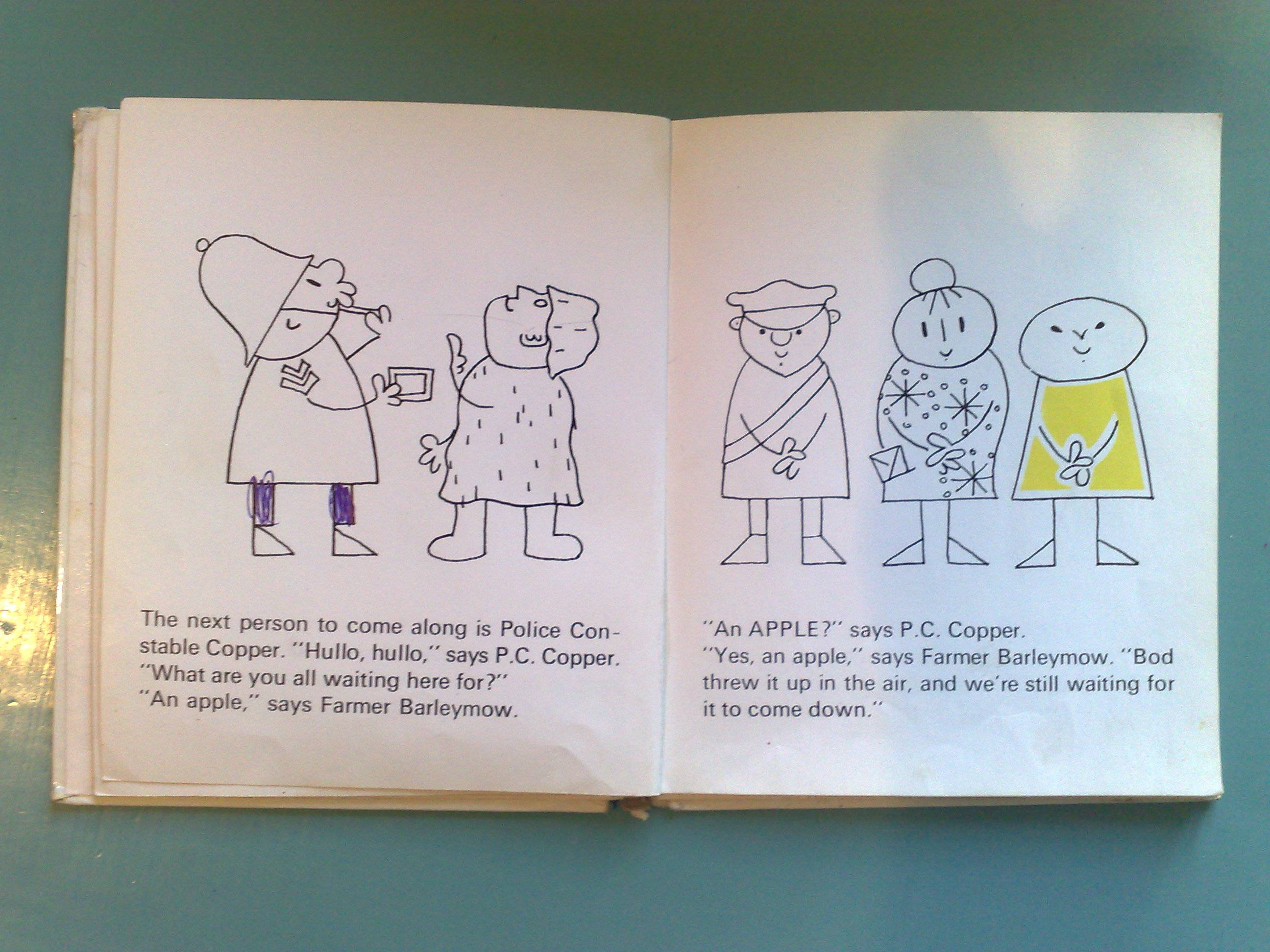 Bod And The Apple First page | Previous page | Next page ![]() Ivan Pope: Now, along comes Police Constable Copper. "Hullo, hullo," says P.C. Copper. "What are you all waiting here for?" P.C. Copper represents authority. Above the postman, the farmer and even Aunt Flo he carries the authority of the state. He wears a helmet and carries a notebook. He has the power to issue edicts that cannot be challenged. Note how angelic Bod is looking. He wont' give P. C. Copper the finger. Bod instinctively knows that this personage is both security and danger in one. "An APPLE?" says P.C. Copper. This is the only shouting in the book. Why does P.C. Copper shout at Farmer Barleymow, who has only politely answered his question? Because the notion of art, of practice undertaken for no reason apart from love of the concept, is anathema to the state. And P.C. Copper is a small man with a badge. |